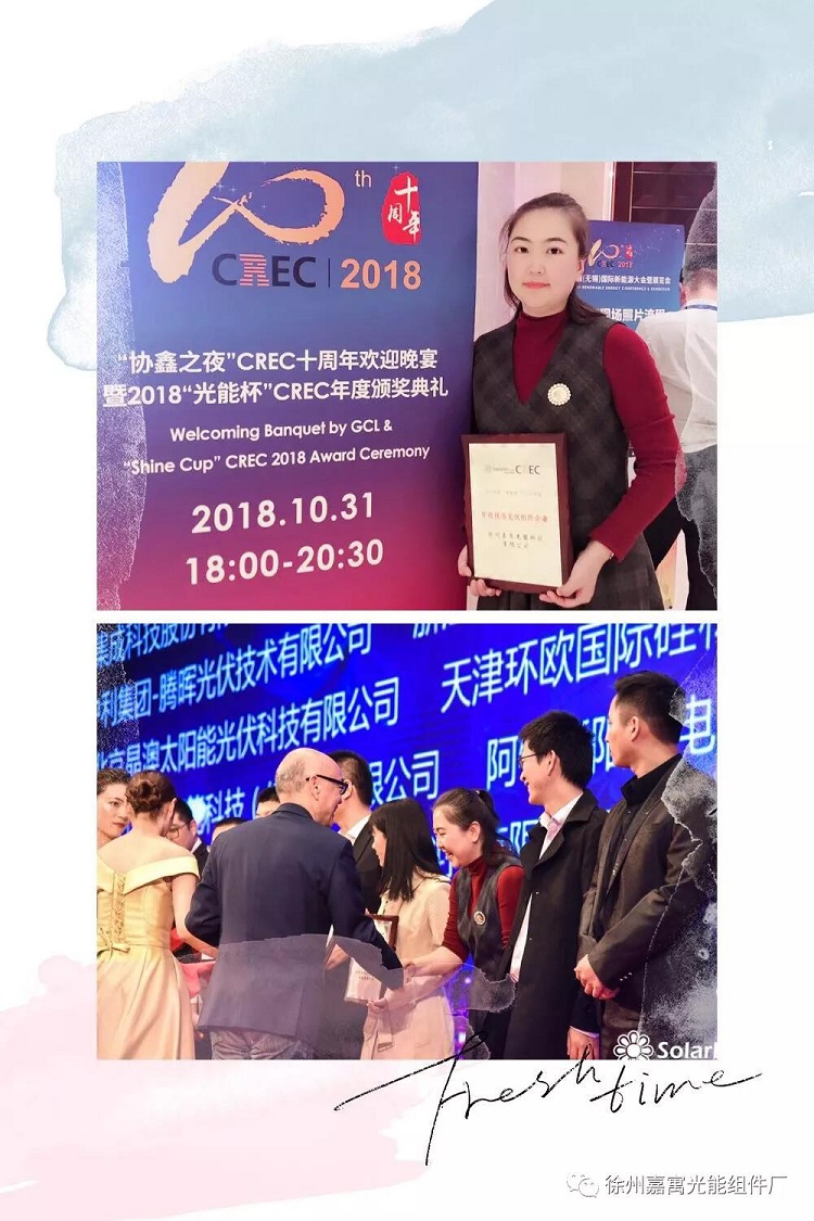 10月31日,由中國(無錫)國際新能源大會暨展覽會CREC、Solarbe索比光伏網、《光能》雜志共同主辦的2018CREC光能杯光伏行業頒獎晚會盛大召開,徐州嘉寓光能榮獲“年度優秀組件企業大獎”。