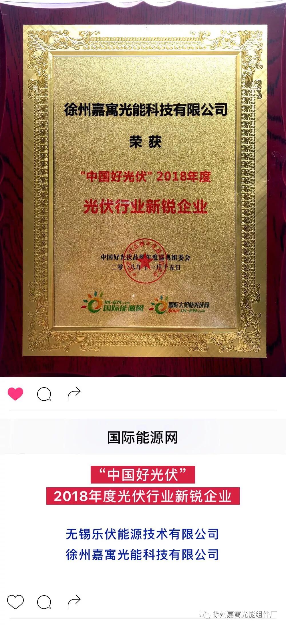 嘉寓光能在中國好光伏評選中再度斬獲光伏組件十大供應商以及年度新銳企業